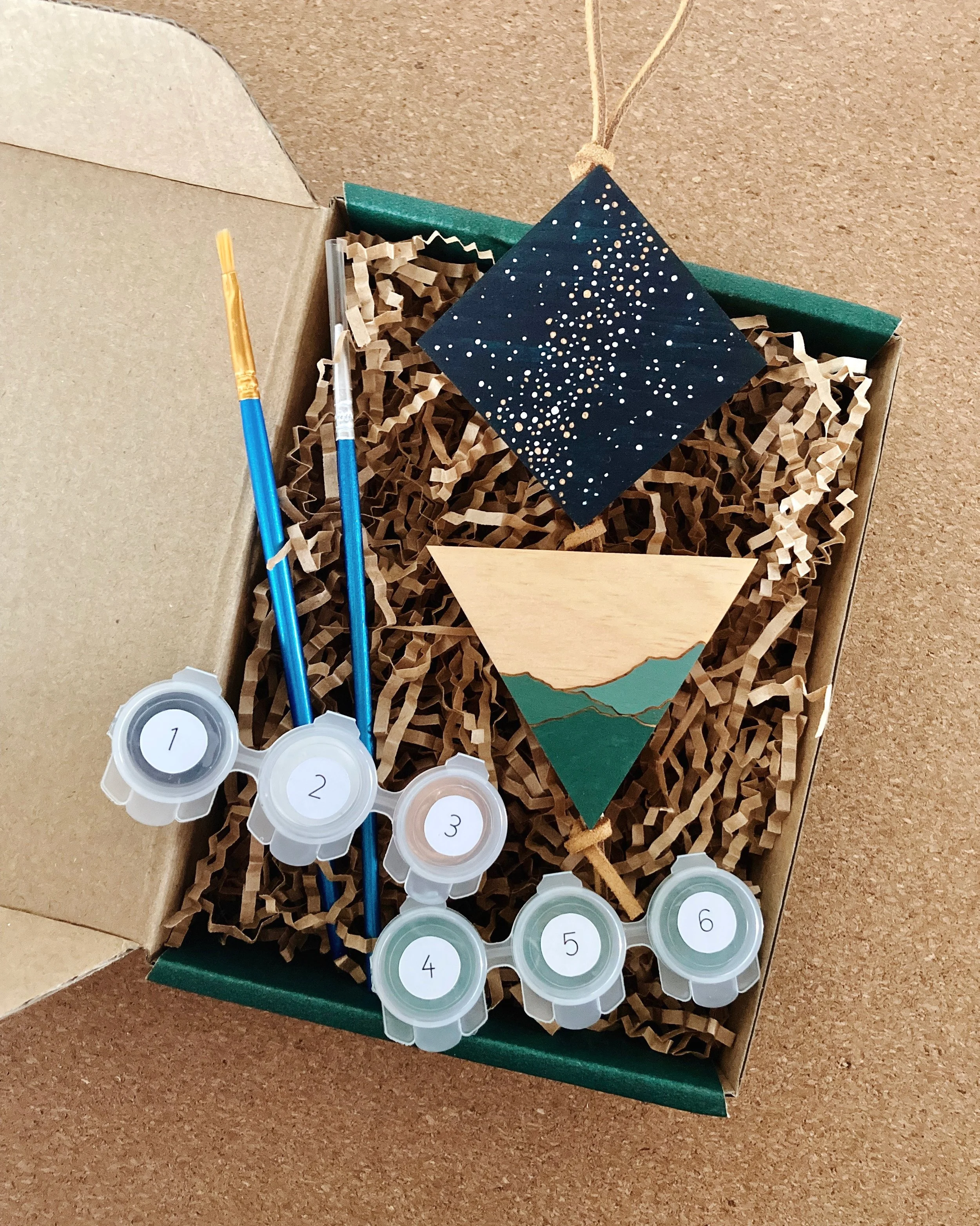 INCLUDED WITH YOUR KIT - Wood wall art piece with burned outlines, 4 pre-mixed artist quality paints, a paint brush, leather hanging cord, and a painting guide with instructions and helpful tips.