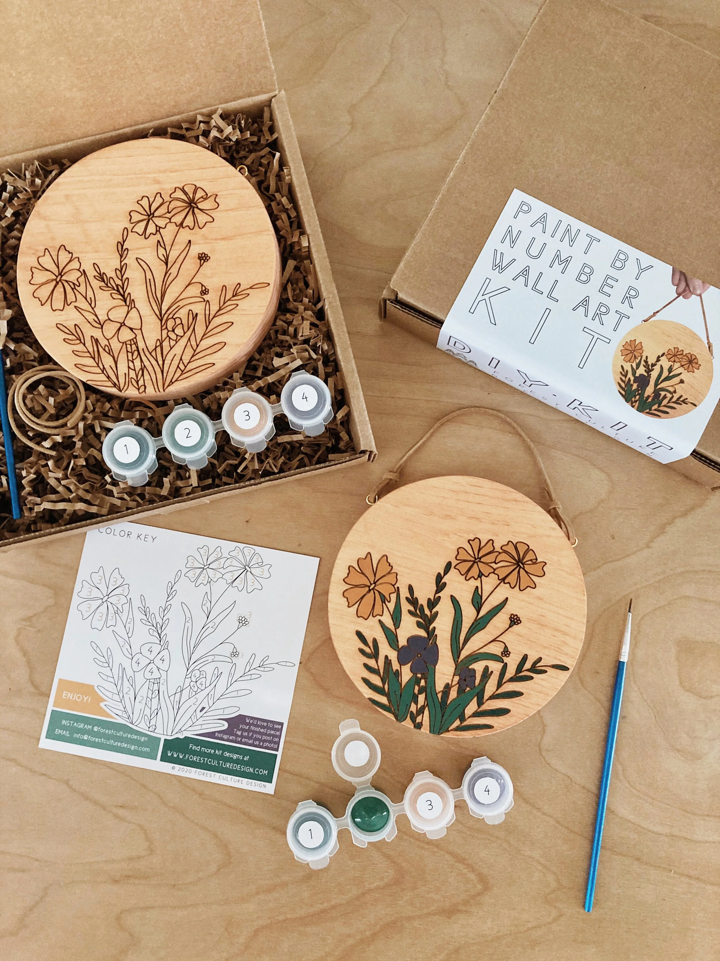 Make your own beautiful painted wall art piece with this paint-by-number kit! All you need to get started is the kit, a cup of water and a paper towel for cleaning your brush, and then a nail or screw to hang your piece when finished. An instruction card shows a numbered pattern for where to paint each of the three hand-mixed artist quality paint colors and also includes tips to help you get the best results. The handmade wood piece already has the wood burned design, so all you have to do is paint the correct color in each numbered space. The finished product will be an eye catching piece that you can hang in your home!