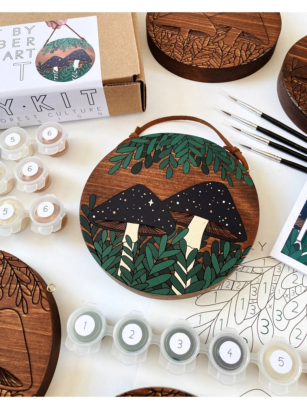 INCLUDED WITH YOUR KIT - Wood wall art piece with burned outlines, 4 pre-mixed artist quality paints, a paint brush, leather hanging cord, and a painting guide with instructions and helpful tips.