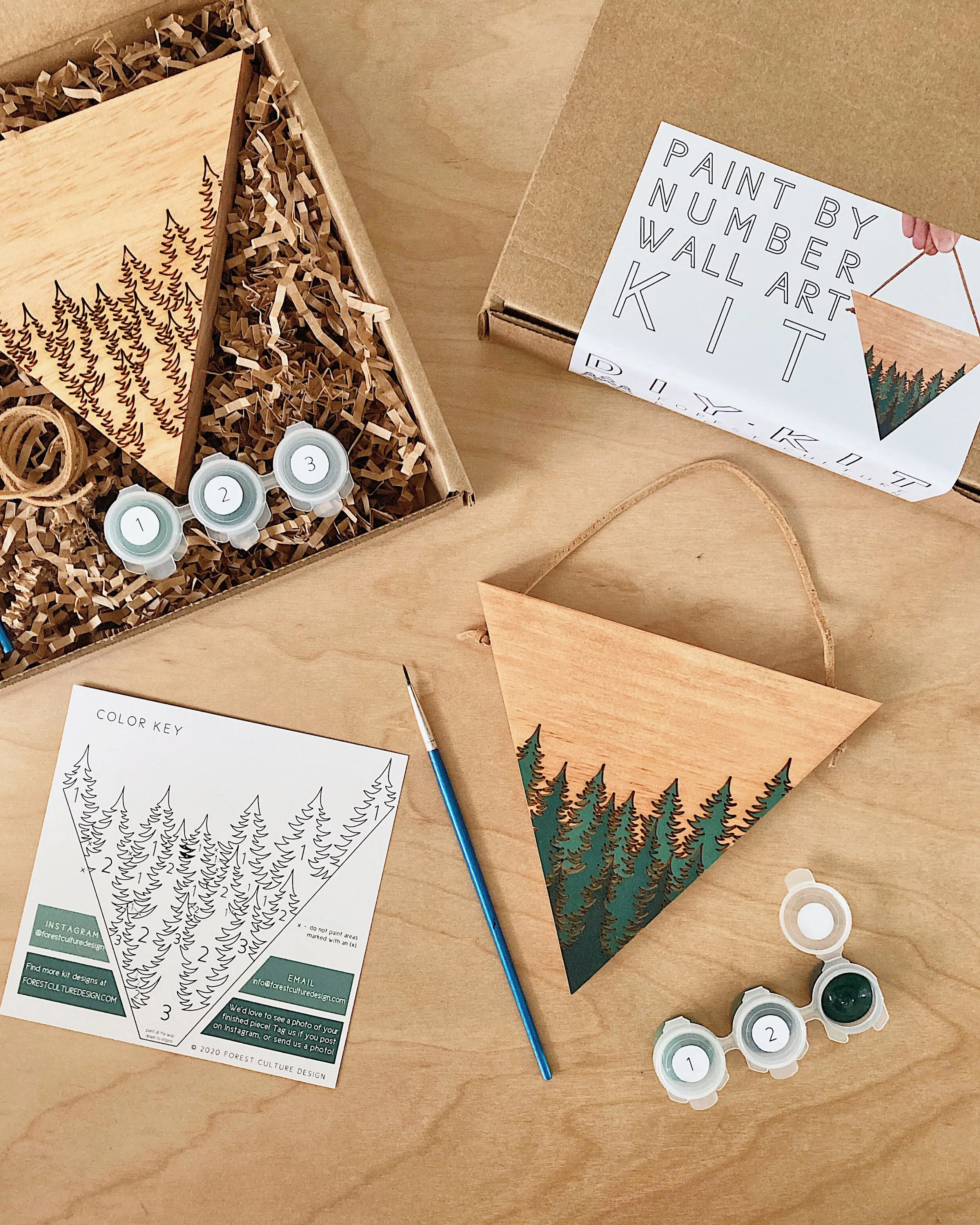 Make your own beautiful painted wall art piece with this paint-by-number kit! With this kit you can paint a calming scene that shows layers of earth toned mountains near the sea. All you need to get started is the kit, a cup of water and a paper towel for cleaning your brush. An instruction card shows a numbered pattern for where to paint each of the seven hand-mixed artist quality paint colors and also includes tips to help you get the best results. The handmade wood piece already has the wood burned design, so all you have to do is paint the correct color in each numbered space. The finished product will be an eye catching piece that you can hang in your home!